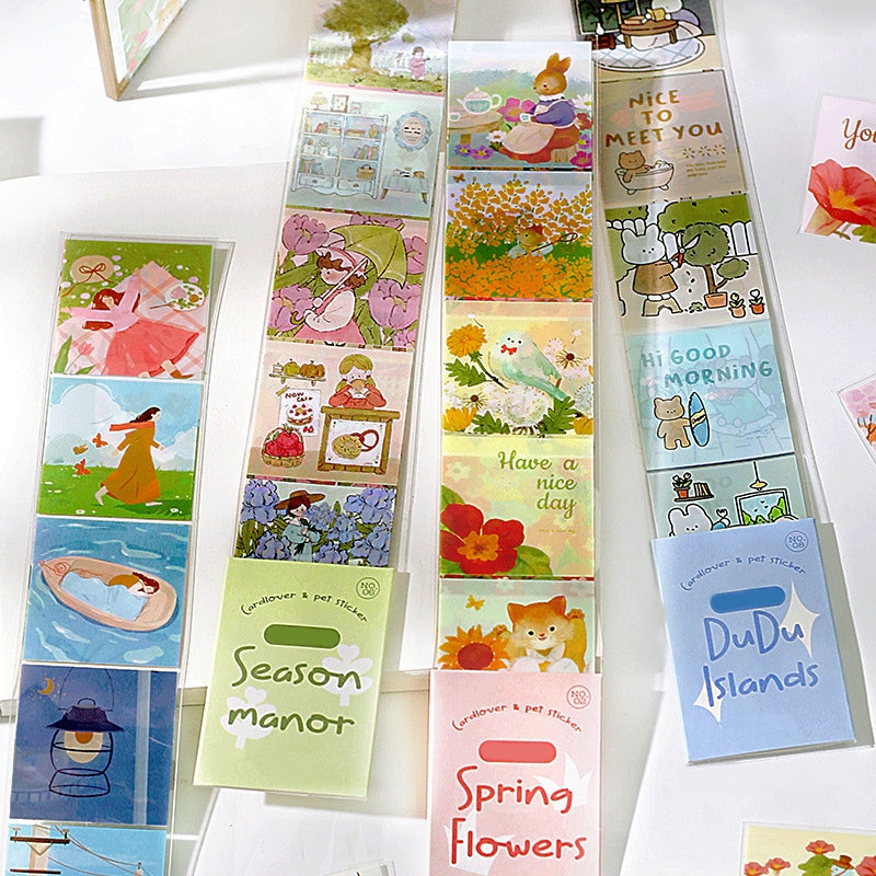 This cute cartoon illustration Polyethylene Terephthalate long strip sticker is made of upgraded Polyethylene Terephthalate, smooth and waterproof. The patterns are clear and translucent, and can be stuck repeatedly without any glue stains left. It has 8 styles to choose from, including kawaii rabbits, flowers, girls, etc. Each style contains 3 pieces of stickers. The plentiful designs and multiple choices can meet your various decoration needs. It's perfect for decorating journals, scrapbooks, collages, greeting cards, invitations, envelopes, and gift wrappings, and it's creative to use them on pens, cups, phone cases, laptop surfaces, etc.